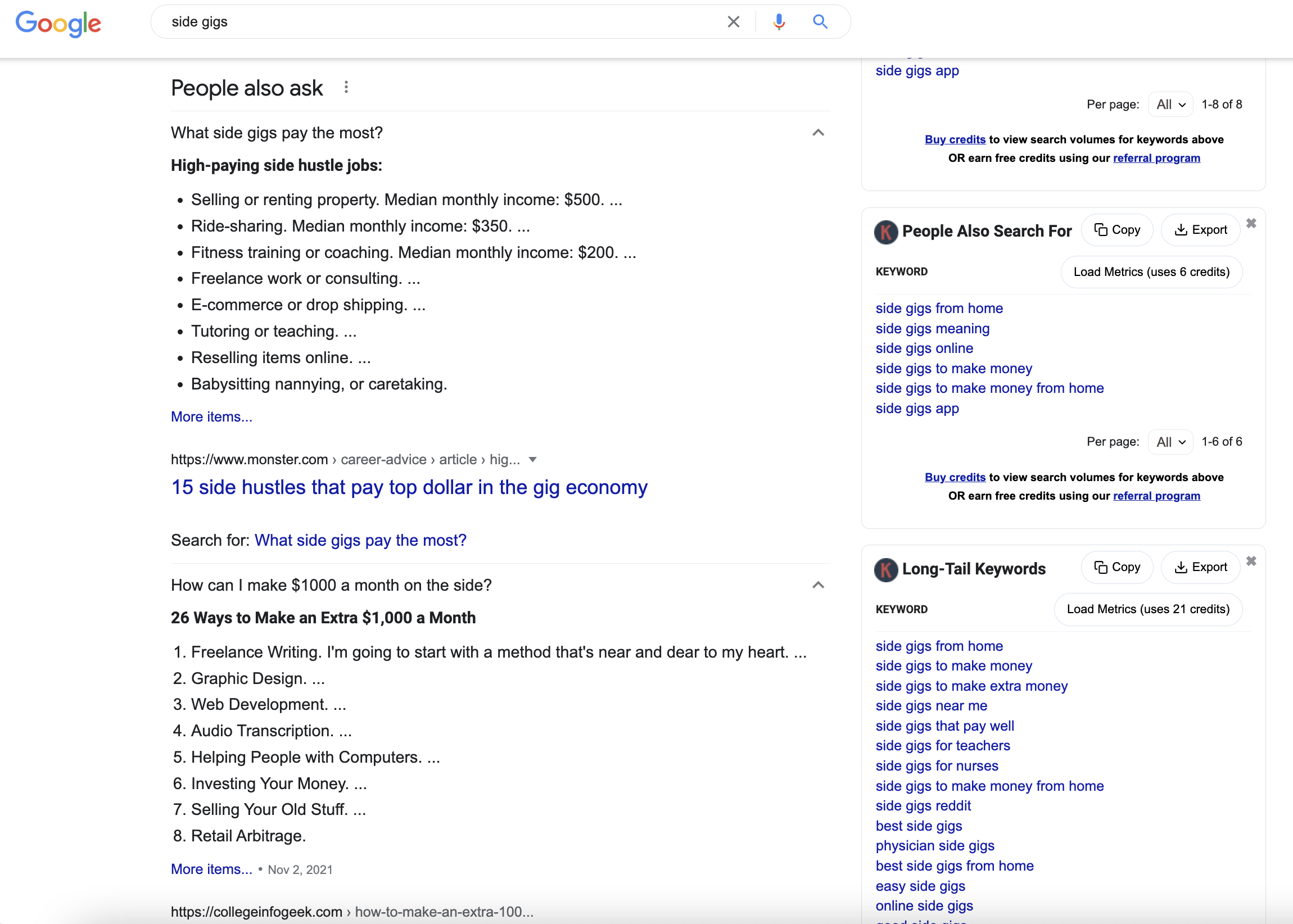 Here’s an example of the SERP for “side gigs”. The PAA results contain a mix of hustle jobs that are more likely to be done by fresh-out-of-college age people and those currently employed but looking to make extra cash on the side.