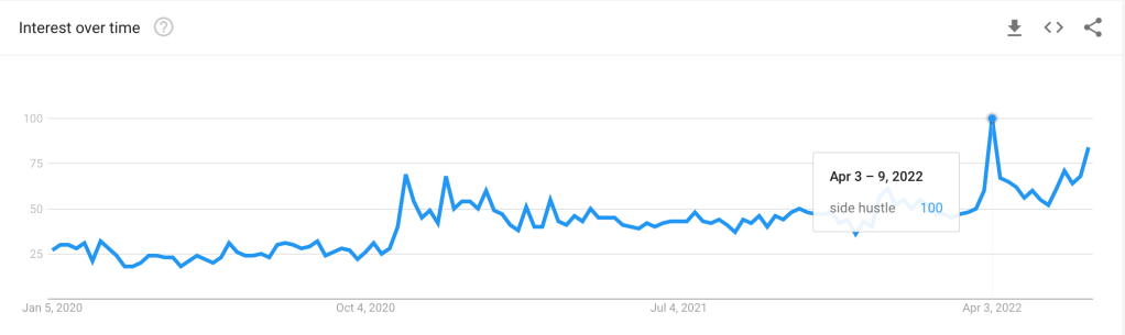 What’s also interesting is that search interest for “side hustle” spiked in November 2020 which, IMO, is late in the year of the COVID-19 pandemic. The’ve peeked in April 2022, potentially related to the increasing cost of gas prices, inflation on goods and services in general.