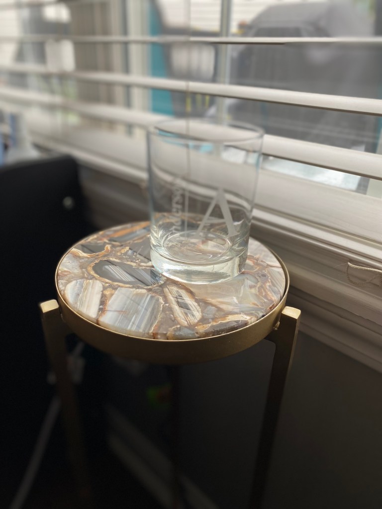 Product specs: 8″ tall Kate and Laurel Aguilar Glam Drink Table with Agate Tabletop