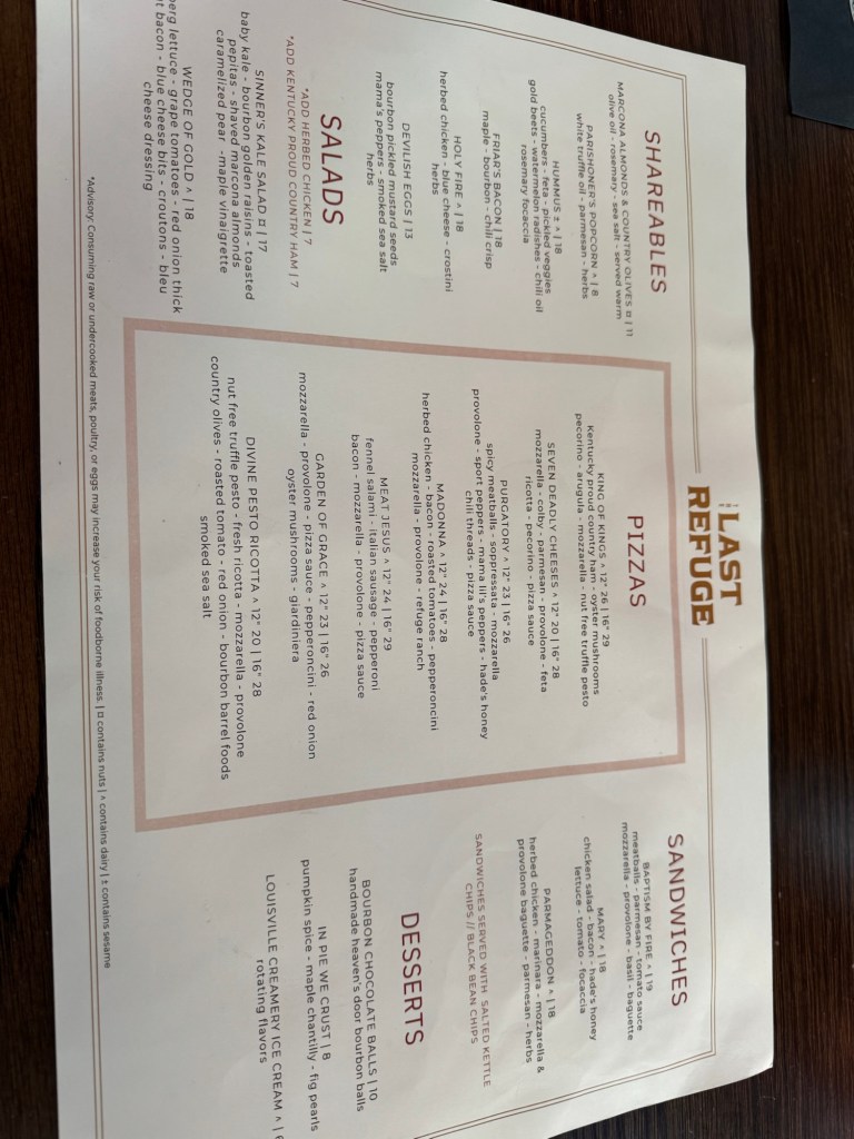 We ordered a pizza and had cocktails. The pizza is really good (Ok, I was hungry too) and it was nice to be able to have some hearty food after the tasting at Michter’s. I highly recommend an afternoon bourbon tasting followed by a reservation at The Last Refuge for food and continued drinks. They also have non-alcoholic ones.