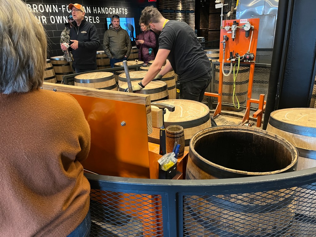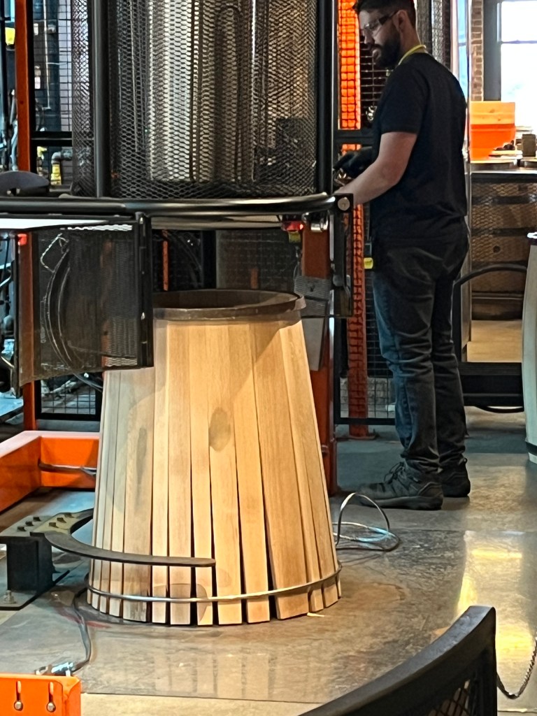 It’s very common for distillery tours to feature cookers or stills, but this is only the fourth or fifth one I can recall that showed an aging area (which at Forrester, was pretty neat). And what sets Forrester’s facility apart: they have their own on-site cooperage — the operation of making (and for the sake of bourbon-aging, charring) barrels. Like every other phase, it’s a small operation (literally it’s one guy making all the barrels), but still very cool to see.